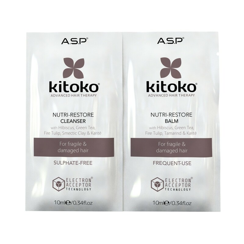 Набір пробників шампуню та бальзамадля пошкодженого та ламкого волосся і сухої шкіри голови Kitoko Nutri-Restore Cleanser & Balm Sachet Duo