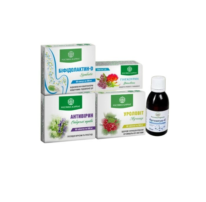 Цистит. Пієлонефрит. Комплексна програма Рослина Карпат Уроловіт, Гінекоурин, Аргентум С, Антивірин, Біфідолкатин-D 5 препаратів