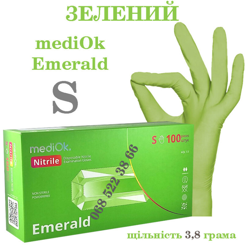 Рукавиці нітрилові зелений Mediok Emerald розмір S, щільність 3.8г, уп.100 шт