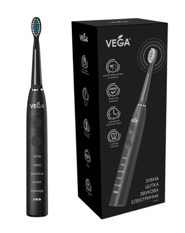 Froomo, маркетплейс професійної косметики та товарів для здоров'я\\Електрична звукова зубна щітка на 5 режимів чищення Vega VT-600 B Чорна