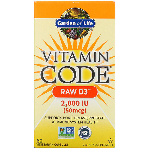 Froomo, маркетплейс професійної косметики та товарів для здоров'я\\Вітамін D Garden of Life Vitamin Code, RAW D3, 50 mcg (2000 IU) 60 Veg Caps GOL-11413